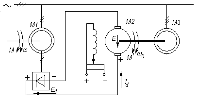 Меняя ток возбуждения машины М2, а следовательно величину Е, можно изменять скольжение, при котором начинается рост тока Id, и, следовательно, регулировать скорость (рис. 4.11,в).