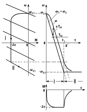 При торможении вхолостую w0 изменяется от значения w01 до нуля. Как и при реверсе, процесс состоит из двух этапов, причем на I этапе (0 < t < t1) кривые w(t) и М(t) не отличаются от аналогичных кривых при реверсе, а на II этапе - подчиняются уравнению (5.10) с соответствующими хнач и хкон.