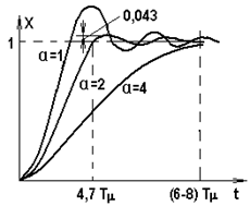 - параметр, характеризующий вид переходного процесса; на рис. 5.26 приведены переходные функции для различных а. Очевидно, что компромисс между колебательностью и длительностью переходного процесса достигается при а = 2, и такая настройка (выбор Т0) называется настройкой на технический оптимум. При этом без большой погрешности можно принять, что