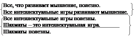 Фигурными скобками выделены два силлогизма, объединенные в полисиллогизм. Обратим внимание на то, что вывод предыдущего силлогизма стал большей посылкой последующего. В этом случае получившийся полисиллогизм называется прогрессивным. Если же вывод предыдущего силлогизма становится меньшей посылкой последующего, то полисиллогизм называется регрессивным. Например: