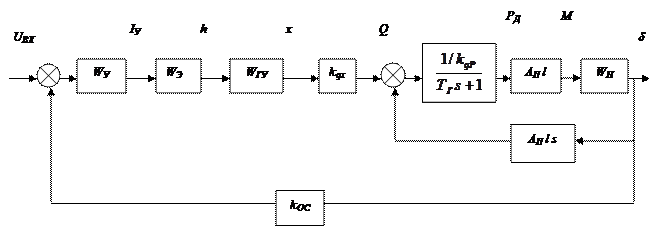 В заключении раздела рассмотрим структурную схему гидравлического рулевого привода в общем случае, которая получена путём соединения в соответствии с функциональной схемой рассмотренных выше отдельных участков структурной схемы.