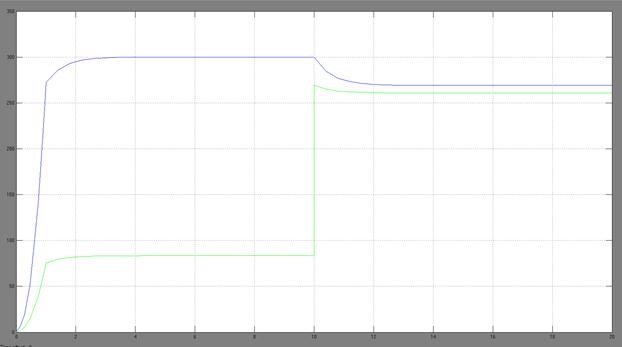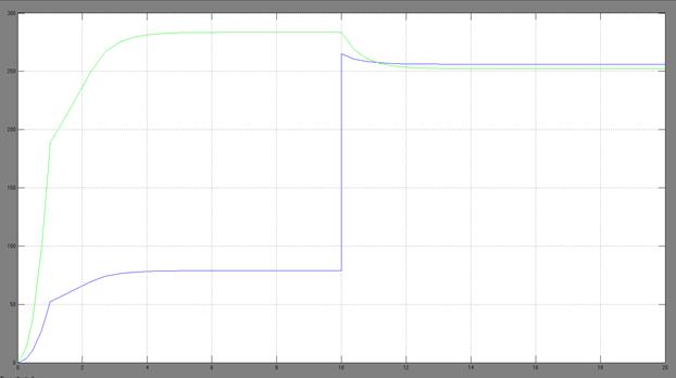 Таким образом, в качестве входного сигнала газогидравлического источника питания задается непроизводительный расход Qут, а с 10 секунды дополнительный скачок расхода жидкости Qрм =0,000181 м3/с, что физически означает отработку одной рулевой машиной сигнала (т.е движения с максимальной скоростью), для отклонения объекта управления, при этом суммарный расход составляет -