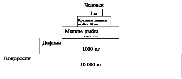 Энергия, поступающая в Биогеоценоз, затрачивается на обеспечение постоянного круговорота веществ, поддержание целостности системы и на ее развитие (эволюцию). Энергия проходит через ряд трофических уровней, являющихся звеньями цепей питания. Цепи питания – ряд взаимосвязанных видов, из которых каждый предыдущий служит пищей последующему. Общая закономерность состоит в том, что в основе любой пищевой цепи – зеленые растения, в конце – плотоядные (хищники). Количество особей и биомасса последовательно уменьшается в каждом следующем звене цепи - это правило экологической пирамиды, пример которой показан ниже.