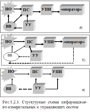 Структура ТС, представ-ленная на рис.1.2.1, может быть положена в основу представления информационно-измери-тельных и управляющих систем как систему, в виде множеств 2-го уровня описания, что и представлено на рис.1.2.2 для ИУС, у которой входная информация в виде оптического излучения (подобные системы в дальнейшем будем обозначать - ИУСО). Подобные технические системы, как правило, могут быть отнесены к сложным системам с подсистемами разной физической природы [58,59,69]. На рис.1.2.3 представлены возможные по реализации структурные схемы ИУС, где приняты следующие обозначения: НО – наблюдаемый (исследуемый) объект; ПС – приёмная система: УПИ – устройство преобразования и представления информации; УУ – управляющее устройство; ВВ – внешние возмущения (пассивные или активируемые УУ). При этом: на рис. 1.2.3а представлена ИУСО с учетом внешних возмущений; на рис. 1.2.3б представлена ИУСО с учетом реакции объекта на внешние возмущения; на рис.1.2.3в представлена ИУСО без учёта внешних возмущений.