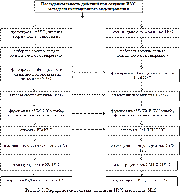 В этой связи можно предложить иерархическую схему последовательности операций при создании ИУС методами имитационного моделирования (см. рис. 1.3.3). Из этой схемы видно, что при проведении приёмо-сдаточ-ных испытаниях (ПСИ) ИУС методами имита-ционного моделирования (ИМ) необходимо учитывать содержательную сторону при выполнении этапа проектирования системы, включая теоретические и экспериментальные исследования (на схеме это обозначено пунктирными стрелками). Необходимо заметить, что каждая операция при проведении имитационного моделирования ИУС должна быть однозначно определена. Следует также отметить, что приведённая на рис.1.3.3 последовательность справедлива, по нашему мнению, и для любой технической системы.