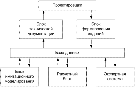 База данных, блок имитационного моделирования, расчетный блок и экспертная система выполняют функции, аналогичные функциям соответствующих блоков АСНИ. Вместо блока связи с измерительной аппаратурой в САПР имеется блок формирования заданий. Проектировщик вводит в блок техническое задание на проектирование, в котором указаны цели, которые необходимо достичь при проектировании, и все ограничения, которые нельзя нарушить. Блок подготовки технической документации облегчает создание технической документации для последующего изготовления изделия.