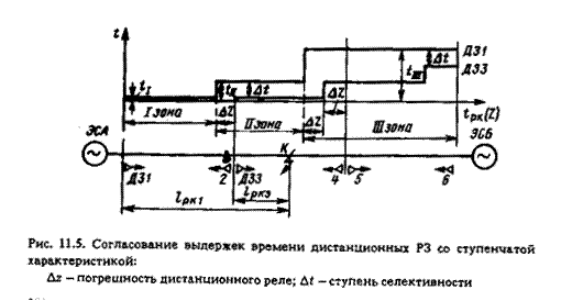 На ЛЭП с двусторонним питанием ДЗ устанавливаются с обеих сторон каждой ЛЭП и должны действовать при направлении мощности от шин в ЛЭП. Дистанционные РЗ, действующие при одном направлении мощности, необходимо согласовать между собой по времени и по зоне действия так, чтобы обеспечивалось селективное отключение КЗ. В рассматриваемой схеме (рис.11.5) согласуются между собой ДЗ1, ДЗ3, ДЗ5 и ДЗ6, ДЗ4, ДЗ2.