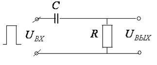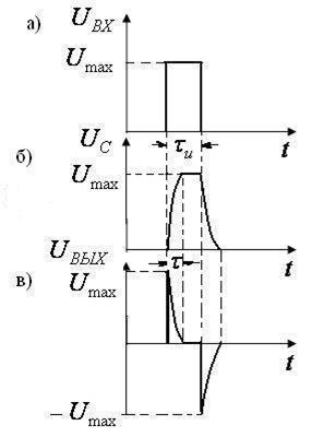 напряжение на конденсаторе остается постоянным. Затем импульс прекращается, конденсатор разряжается (рис. б). Вычитая значения функции, представленной на рис.б из значений функции, представленной на рис.а, получаем вид функции выходного напряжения (рис. в). Т.о. на выходе из цепочки получаются два кратковременных остроконечных импульса противоположного знака.