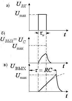 Если на вход цепи подан прямоугольный импульс (рис. а), то напряжением на выходе является напряжение на пластинах конденсатора, которое при зарядке имеет экспоненциально нарастающую и при зарядке экспоненциально спадающую форму (рис.б). Конденсатор не успевает зарядиться до