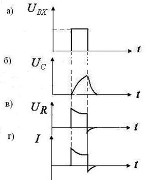 На рис. а) показан импульс входного напряжения. При вклю-чении цепочки конденсатор заряжается в течение времени