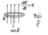 в какой-либо точке пространства вызывает появление в смежных точках вихревого электрического поля, силовые линии которого охватывают линии магнитного поля и расположены в перпендикулярных линиям