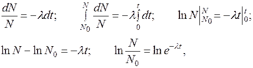 пропорциональна вероятности распада ядра и для каждого вида ядер является индивидуальной величиной). “ - “ означает убыль числа нераспавшихся ядер со временем.
