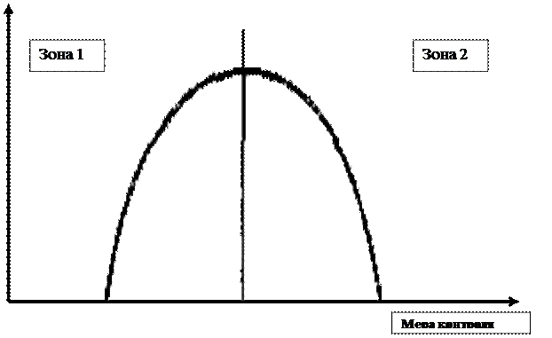 Зона I. Рост меры контроля увеличивает эффективность организации до тех пор, пока затраты на контроль и создаваемые им помехи не превосходят собственный положительный эффект контроля.