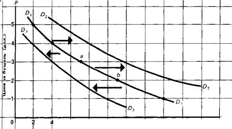 Таким образом, движение вдоль кривой спроса отражает изменение величины спроса: чем выше цена, тем ниже (при прочих равных условиях) величина спроса, и наоборот: чем ниже цена, тем выше величина спроса (см. рис.). Сдвиг кривой спроса отражает изменение спроса: оно происходит под влиянием факторов, определяющих функцию спроса.
