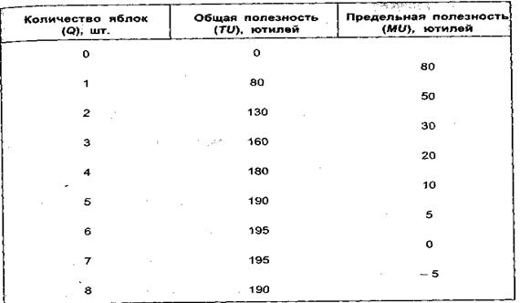 Прежде всего обратим внимание на то, что кривая общей полезности имеет положительный наклон, указывающий, что по мере увеличения потребляемого количества яблок общая их полезность возрастает (пока потребляется не более 6 яблок). Вместе с тем кривая предельной полезности, характеризующая приращение общей полезности, имеет отрицательный наклон, что является следствием закона убывающей предельной полезности. При этом предельная полезность седьмого яблока оказывается нулевой. Это говорит о том, что общая полезность достигает максимальной величины при потреблении семи яблок.