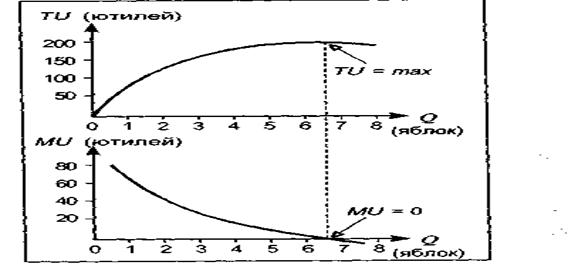 Общая полезность увеличивается с ростом потребления яблок. Поэтому кривая TU имеет положительный наклон, который постепенно уменьшается. Предельная полезность уменьшается по мере роста потребления яблок. В связи с этим кривая МU имеет отрицательный наклон. Когда величина общей полезности потребляемого количества яблок достигает максимума, предельная полезность последнего яблока оказывается равной нулю.