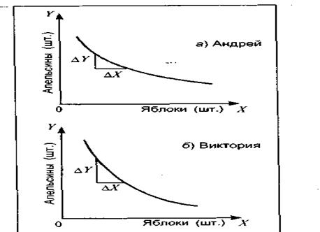 Форма кривой безразличия говорит о вкусах потребителя, показывает, в какой степени он готов пожертвовать одним благом ради получения другого. На рис. представлены кривые безразличия двух потребителей — Андрея (А) и Виктории (В), которым предстоит делать выбор между апельсинами и яблоками.