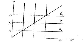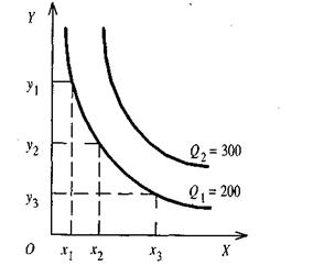 Рассмотрим вариант, когда переменными являются два фактора производства, которые при определенном сочетании дают в результате один объем производимого продукта. Возьмем, например, затраты труда и капитала при производстве обуви. Затраты труда обозначим за X, затраты капитала — через У. При определенной комбинации этих двух факторов может быть произведено 200 пар обуви (Q = 200). Изменение капитала и труда может происходить в обратном направлении. Если количество капитала (применяемого оборудования) увеличивается, то, следовательно, применение живого труда — уменьшается. При этом возрастание одного фактора и уменьшение другого происходят таким образом, что общий объем производства остается на прежнем уровне.