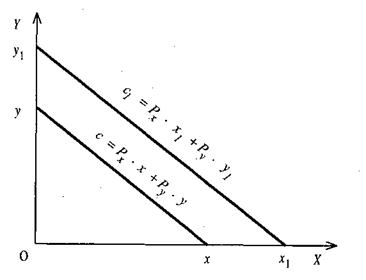 Производитель может приобретать необходимые факторы в определенном сочетании, которое не выходит за рамки его бюджетных возможностей. Тогда его затраты на приобретение фактора х составят Рх • х, фактора у соответственно — Ру • у. Общие затраты (С) составят: