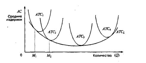 На рис. представлены семейство кривых краткосрочных средних издержек, соответствующих разным (возрастающим) вложениям постоянных факторов, и огибающая их кривая долгосрочных средних издержек