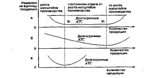 Если кривая долгосрочных средних издержек имеет отрицательный наклон, то это означает положительный эффект масштаба; если она горизонтальна, это означает постоянную отдачу от роста масштаба; наконец, если кривая имеет положительный наклон, то эффект масштаба отрицательный.
