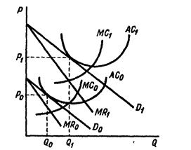 Затраты на рекламу увеличили затраты на единицу выпуска (АС0-+АС1), но одновременно возрос спрос на продукцию фирмы (D0 – D1), и в итоге ее выручка увеличилась.