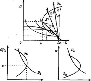 Совмещая кривые предложения труда и спроса на труд (рис. б), мы получаем не обычный крест, а более сложную фигуру, в которой имеются две точки пересечения кривых.