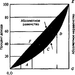 Уровень неравенства определяется с помощью коэффициента Джини. Он рассчитывается как отношение площади фигуры ОАВСОЕР (на рис. она закрашена) к площади треугольника ОЕG. Чем больше коэффициент Джини, тем больше неравенство.