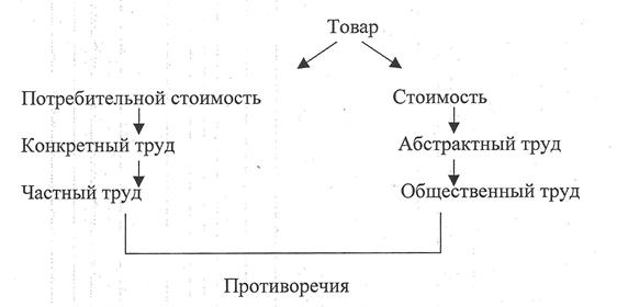 Противоречия товарного производства выражаются в противоречии потребительной стоимости и стоимости как противоречие между конкретным и абстрактным трудом, как трудом частным и общественным.