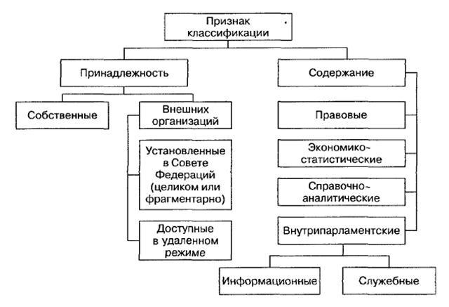 Базы данных можно классифицировать по принадлежности и содержанию (рис. 3). По содержанию информации они классифицируются на правовые, экономико-статистические базы, справочно-аналитические и внутрипарламентские [22].