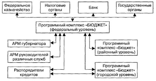 В бюджетной системе, которая функционально связана с налоговыми учреждениями решением задачи формирования доходной и расходной частей бюджета, основным инструментальным прикладным программным средством является программный комплекс «Бюджет», который обеспечивает информационные связи с Федеральным казначейством, налоговыми органами, банками, распорядителями кредитов, подчиненными финансовыми органами городов и районов и т. д. Программный комплекс «Бюджет» имеет единую БД и единый пользовательский интерфейс. Схема взаимодействия программного комплекса «Бюджет» с различными службами представлена на рис. 6.