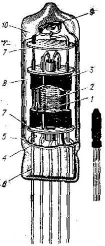 Она состоит из системы электродов: (подогревный термокатод 1; управляющий электрод — сетка 2; коллектор электронов — анод 3), смонтированных на стеклянной ножке 4, через которую проходят выводы электродов 5, присоединенные к штырькам 6. Положение всех электродов фиксируется слюдяными пластинами 7. Арматура лампы помещена в баллон 8, из которого затем откачивается воздух до давления около 10-5 — 10-6 Па. В каждой лампе в процессе монтажа электродов устанавливается газопоглотитель (геттер). При окончании процесса откачки геттер (чаще всего— барий) испаряется из таблетки 9, укрепленной на полочке газопоглотителя. Осаждаясь на внутренней стенке баллона, геттер образует серебристый зеркальный слой 10, который связывает газ, оставшийся в баллоне или выделяющийся впоследствии из электродов в процессе работы лампы.