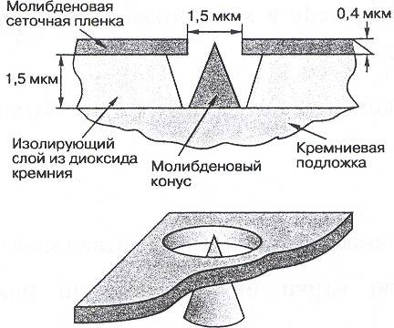 Верхний проводник является сеточной пленкой с отверстием диаметра 1—3 мкм, сквозь которое протравлена полость в изоляторе до нижнего проводника (подложки). На подложке находится металлический конус (эмиттер), и его вершина располагается в отверстии сеточной пленки. Размеры этой конструкции очень малы и составляют единицы микрон. Это позволяет обеспечить высокие значения напряженности поля при небольших приложенных напряжениях (20—400 В) и существенно снизить требования к давлению, поскольку даже при сравнительно плохом вакууме расстояние между электродами оказываются меньше длины свободного пробега.