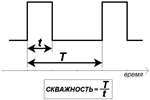 Скважность – это отношение длительности периода следования импульсов к длительности одного импульса. Например, скважность, равная трём, означает, что длительность одного импульса ток в три раза меньше длительности периода следования импульсов и в два раза меньше длительности бестоковой паузы.