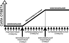 Почему это происходит? Нервные волокна имеют разный порог раздражения. Когда фиксируется минимальный порог раздражения? Когда возбудились волокна имеющие наименьшие пороги раздражения. При увеличении силы стимула всё большее количество волокон вовлекается в реакцию возбуждения. При достижении максимального порога преодолеваются пороги раздражения всех волокон.