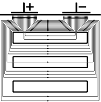Рис. 210041846. Ветвление тока в ткани при раздражении через наружные (внеклеточные) электроды (схема). Волокна обведены толстой линией, между ними – межклеточные щели[Мф53]. Объяснение в тексте.