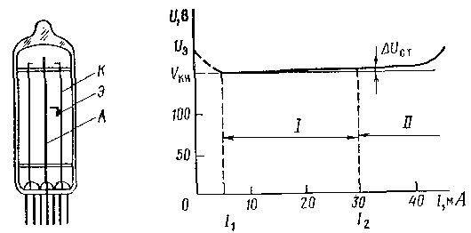 Вольт-амперная характеристика прибора и схема его включения приведены на рис.4.8 и 4.9. При увеличении напряжения между электродами в момент, когда оно становится равным Uз, в приборе возникает тлеющий разряд и при дальнейшем увеличении напряжения источника питания увеличивается ток через прибор, а падение напряжения между его электродами остается почти постоянным, равным Vки. Область I характеристики соответствует нормальному тлеющему разряду, область II —аномальному. Комбинируя газы (смеси) и материалы катода, можно получать Vки в довольно широком диапазоне, от 35 до нескольких сотен вольт. Зависимость Vки от давления и формы электродов очень невелика. Интервал изменения токов от I1 до I2, в пределах которого остается почти неизменным напряжение Uст на приборе, определяется размерами катода.