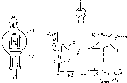 Стабилитрон выполняют в виде стеклянного баллона, в котором помещены на слюдяных или керамических изоляторах два металлических электрода в виде коаксиальных цилиндров (рис.4.8): внешний цилиндр — холодный катод К и тонкая проволока внутри него — анод А. Катод выполняется из никеля, покрытого цезием или редкоземельными элементами (Се, Рr, La, Nd и др.), или из молибдена. Для понижения напряжения возникновения разряда Uз на внутренней поверхности катода часто прикрепляют небольшой электрод Э. Прибор наполняется смесью инертных газов (чаще всего —Ne или Не+1%Аr) до давления от десятых паскалей до нескольких кПа.