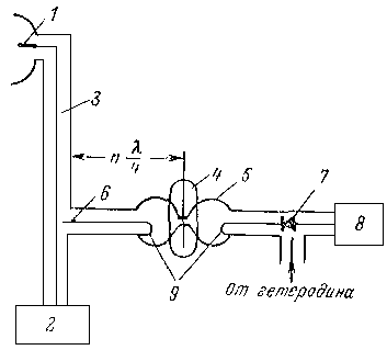 1 — антенна; 2 — передатчик; 3 — антенно-фидерный тракт; 4 — разрядник: 5 — объемный резонатор; 6 — штырь связи; 7 — полупроводниковый диод-смеситель; 8 — усилитель промежуточной частоты; 9 — петли связи.
