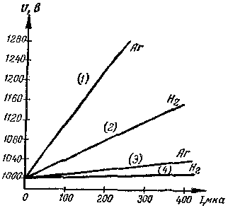 Коронный разряд является разрядом самостоятельным. Для него характерны высокие напряжения на электродах (до 30 кВ и более) и малые токи (в ионных приборах—доли миллиампера). С ростом тока коронный разряд переходит в тлеющий (в разреженном газе) или в искровой (при давлениях порядка атмосферного). Ток коронного разряда в отличие от тока тлеющего и дугового разряда ограничивается самим разрядом, а не внешним добавочным сопротивлением, так как электропроводность тёмного слоя коронного разряда очень мала и плазма здесь не образуется. Вольтамперная характеристика коронного разряда в общем случае является возрастающей (рис.4.13) и потому малопригодна для стабилизации напряжения. Но при определённом выборе газа и геометрии электродов она на значительном участке может быть близка к горизонтальной. На рис. 4.13 характеристики коронного разряда (1) и (2) сняты соответственно для аргона и водорода при отношении радиусов катода и анода