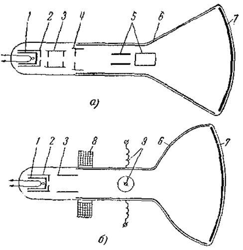 а— с электростатическим управлением; б — с магнитным управлением; 1 — катод;