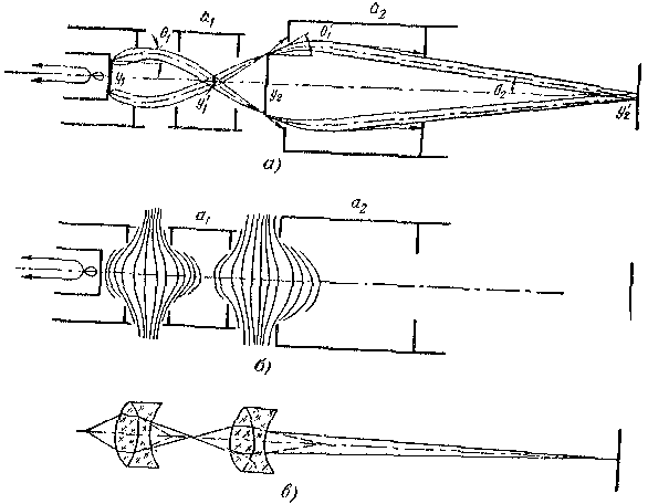 Для уменьшения размера изображения следует увеличивать угловое увеличение M0=θ2/θ1, уменьшать размер объекта y1 и соотношение скоростей электронов до и после оптической системы. При использовании оптической системы с одной линзой выполнение этих условий встречает очень серьезные затруднения. Объектом в такой системе является эмиттирующая поверхность катода. Уменьшение ее величины неизбежно будет сопровождаться снижением плотности тока, и размер изображения — пятна па экране трубки — будет зависеть от потенциала модулятора. Угол θ1 выхода электронов с поверхности катода определяется тепловыми скоростями электронов и не может быть значительно уменьшен. Поэтому в электроннолучевых трубках применяют фокусирующие системы из двух линз, где объектом для второй линзы служит скрещение