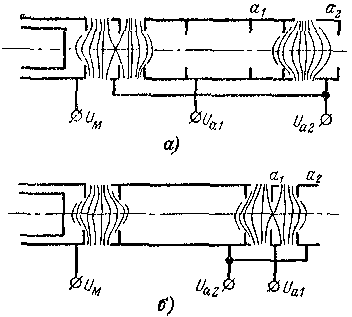 а — с ускоряющим электродом; б — с нулевым током первого анода.