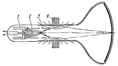 1— модулятор; 2 — экранирующий электрод; 3 — первый анод; 4 — фокусирующая катушка.