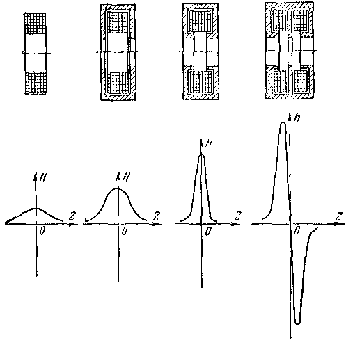 Для увеличения преломляющей силы магнитной линзы, а также для локализации магнитного поля в ограниченном пространстве фокусирующие катушки заключаются в экраны. Такие катушки называются панцирными. Различные конструкции экранов показаны на рис.5.17, где, кроме того, приведены кривые распределения напряженности магнитного поля вдоль оси трубки.