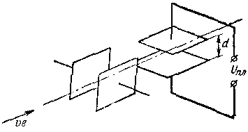 Электростатическая система. Простейшая электростатическая отклоняющая система состоит из двух пар плоских параллельных пластин, расположенных друг за другом (рис.5.18). Одна пара пластин служит для отклонения электронного луча в горизонтальной плоскости, другая пара отклоняет луч но вертикали. Если пренебречь краевым эффектом, то можно считать, что между пластинами существует однородное электрическое поле напряженностью ξ=Uпл/d.