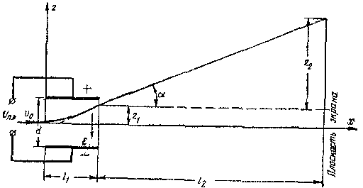Отклонение z2 равно: z2= l 2tgα. Но tgα=dz/dx характеризует наклон касательной к траектории электрона в точке его выхода из пластин: