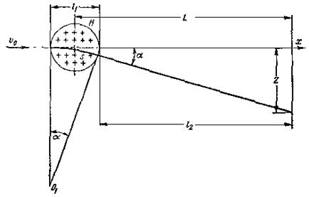 По выходе из магнитного поля, электрон продолжает движение по касательной к его криволинейной траектории в точке выхода из поля. Он отклонится от оси трубки на некоторую величину: z=Ltgα. При малых величинах угла α≈tgα; z≈Lα.
