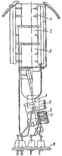 1 — второй анод; 2 — первый анод: 3 — второй ускоряющий электрод; 4 — поперечное магнитное поле; 5 — первый ускоряющий электрод; 6 — модулятор; 7 — катод; 8 — ножка.