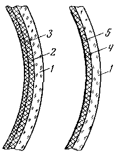 а — с двойным слоем люминофора (с длительным послесвечением): б — с алюминиевой подложкой; 1 — стекло; 2 — люминофор с длительным послесвечением желтого цвета; 3 — люминофор с коротким послесвечением синего цвета; 4 — люминофор; 5 — алюминий.
